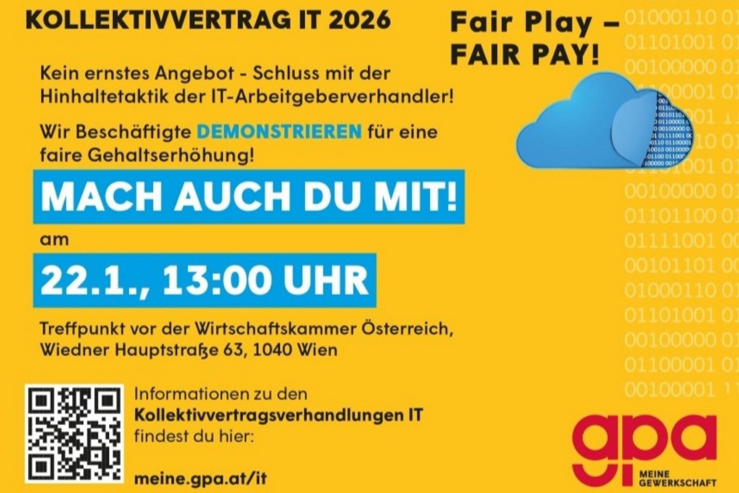 Die Gewerkschaft GPA wird mit den IT-Beschäftigten am 22.01.2026 um 13:00 Uhr vor der Wirtschaftskammer Österreich, Wiedner Hauptstraße 63, 1040 Wien für einen fairen Gehaltsabschluss demonstrieren.