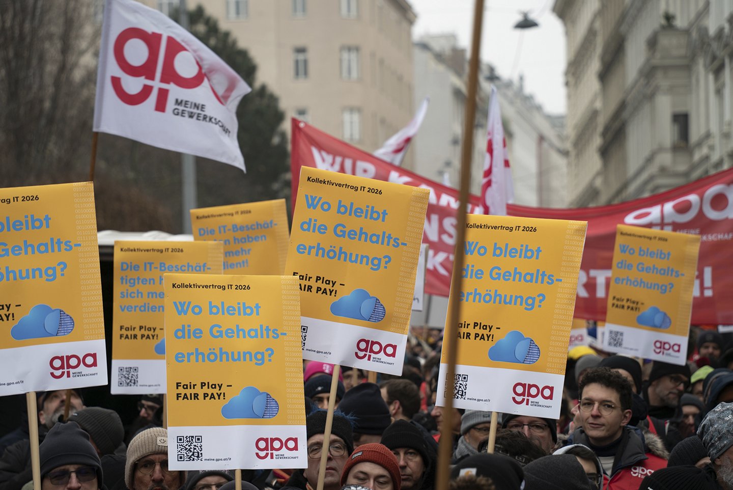Tausende Beschäftigte der IT-Branche demonstrierten am 22. Jänner 2026 vor der Wirtschaftskammer (WKO) in Wien um ein Ende der Blockadehaltung der Arbeitgeber einzufordern. „Vier Verhandlungsrunden ohne ein Angebot für die Ist-Gehaltssumme: Das ist absolut inakzeptabel!“, erklärt Sandra Steiner, Verhandlungsleiterin der Gewerkschaft GPA. Diese Blockadehaltung verhindert einen vernünftigen Kollektivvertragsabschluss. Wir erwarten uns in der morgigen Verhandlungsrunde ein ernsthaftes Angebot, das die Leistungen der Beschäftigten in der IT anerkennt.